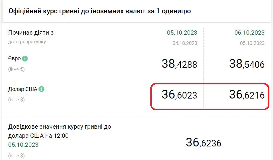 Національний банк на 6 жовтня опустив офіційний курс гривні до долара трохи сильніше, ніж за два попередні дні — майже на 2 копійки: з 36,6023 грн/$до 36,6216 грн/$. Хоча 4-5 жовтня він наважувався його рухати лише на 1-1,2 копійки.
