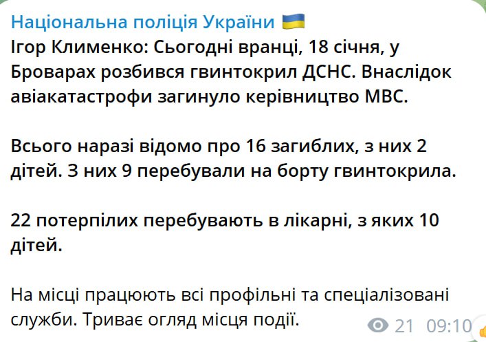 З'явилася офіційна інформація ДСНС з авіакатастрофи у Броварах. Зокрема, називають склад екіпажу - 6 осіб оперативної групи МВС, включаючи керівництво міністерства, та 3 члени екіпажу ДСНС.