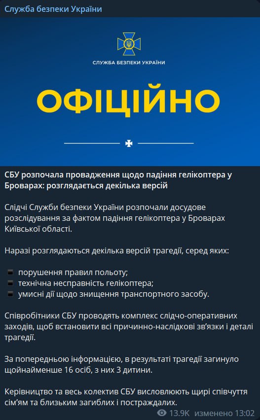 "Причини трагедії встановлюються слідчими. Чи це була диверсія, несправність техніки, порушення правил безпеки польотів, ми скоро дізнаємося", - заявив він у своєму телеграм-каналі.