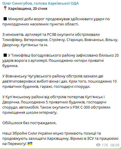 Ворог продовжує обстрілювати мирне населення Харківщини. Фото: телеграм-канал Олега Синєгубова