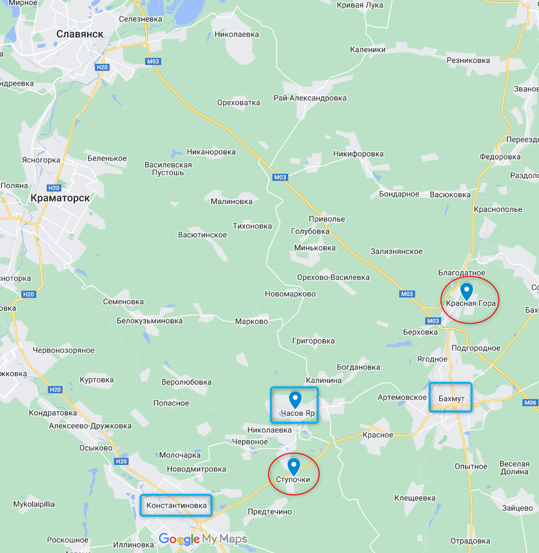 "Глава ДНР" Пушилін заявив сьогодні, що ця дорога (з Костянтиновича до Бахмута) вже під вогневим контролем РФ і по суті блокована. Україна цього не підтверджувала. При цьому до Костянтинівки з Бахмута в будь-якому випадку можна дістатися альтернативною трасою через Годинник Яр. Також з Годин Яру міста йдуть дороги на Слов'янськ та Краматорськ.