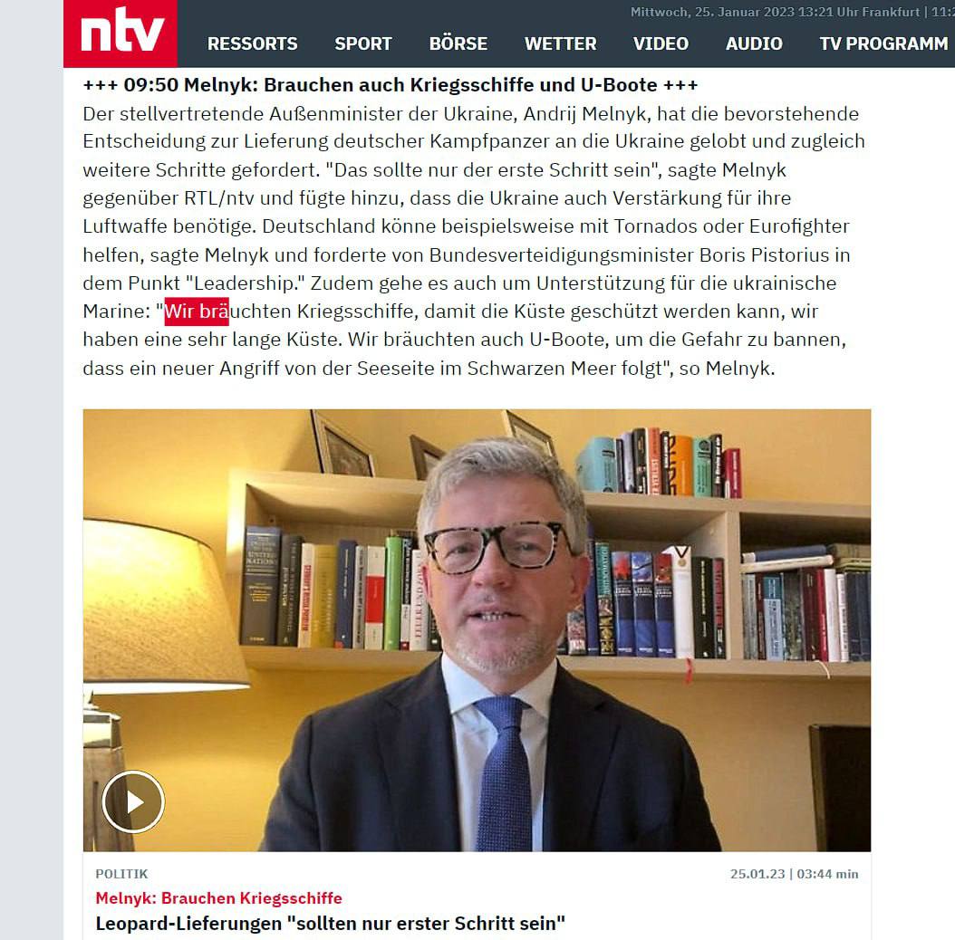 Заступник глави МЗС України та колишній посол у Німеччині Андрій Мельник вважає, що після поставок німецьких танків Україні мають бути передані також винищувачі та підводні човни.