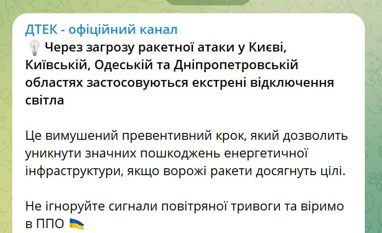 07:52 Ряд регіонів почали превентивні відключення світла - такі повідомлення прийшли з Черкаської та Дніпропетровської областей.