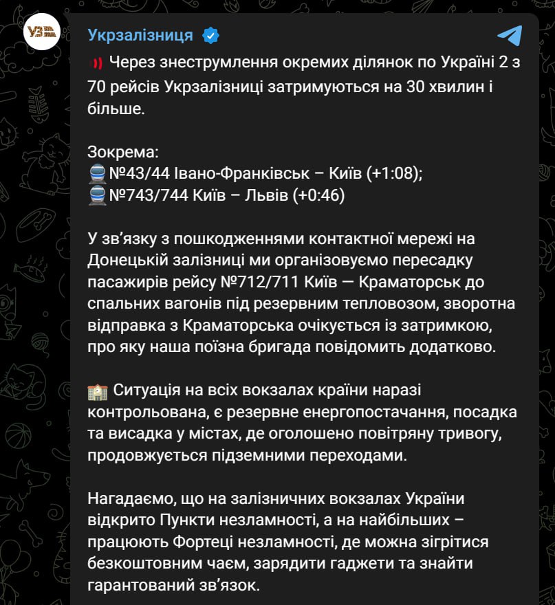 09:43 В Україні після початку ракетної атаки почалися затримки поїздів.