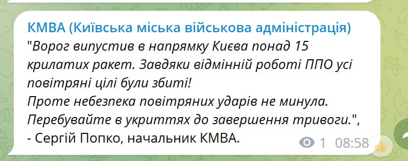 08:27 Глава Офісу президента Єрмак повідомляє про перші збиті ракети противника.