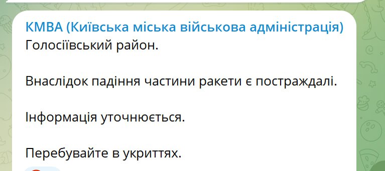 10:40 У Голосіївському районі Києва впала частина ракети. Є постраждалі, повідомляє міська військова адміністрація.