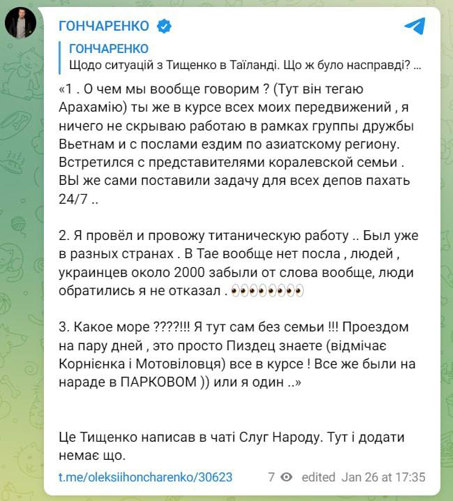 «1. Про що ми взагалі говоримо? Давиде Арахамія, ти ж в курсі всіх моїх пересувань, я нічого не приховую працюю в рамках групи дружби В'єтнам і з послами їздимо азіатським регіоном. Зустрівся із представниками королівської родини. Ви самі поставили завдання всім депів орати 24/7.