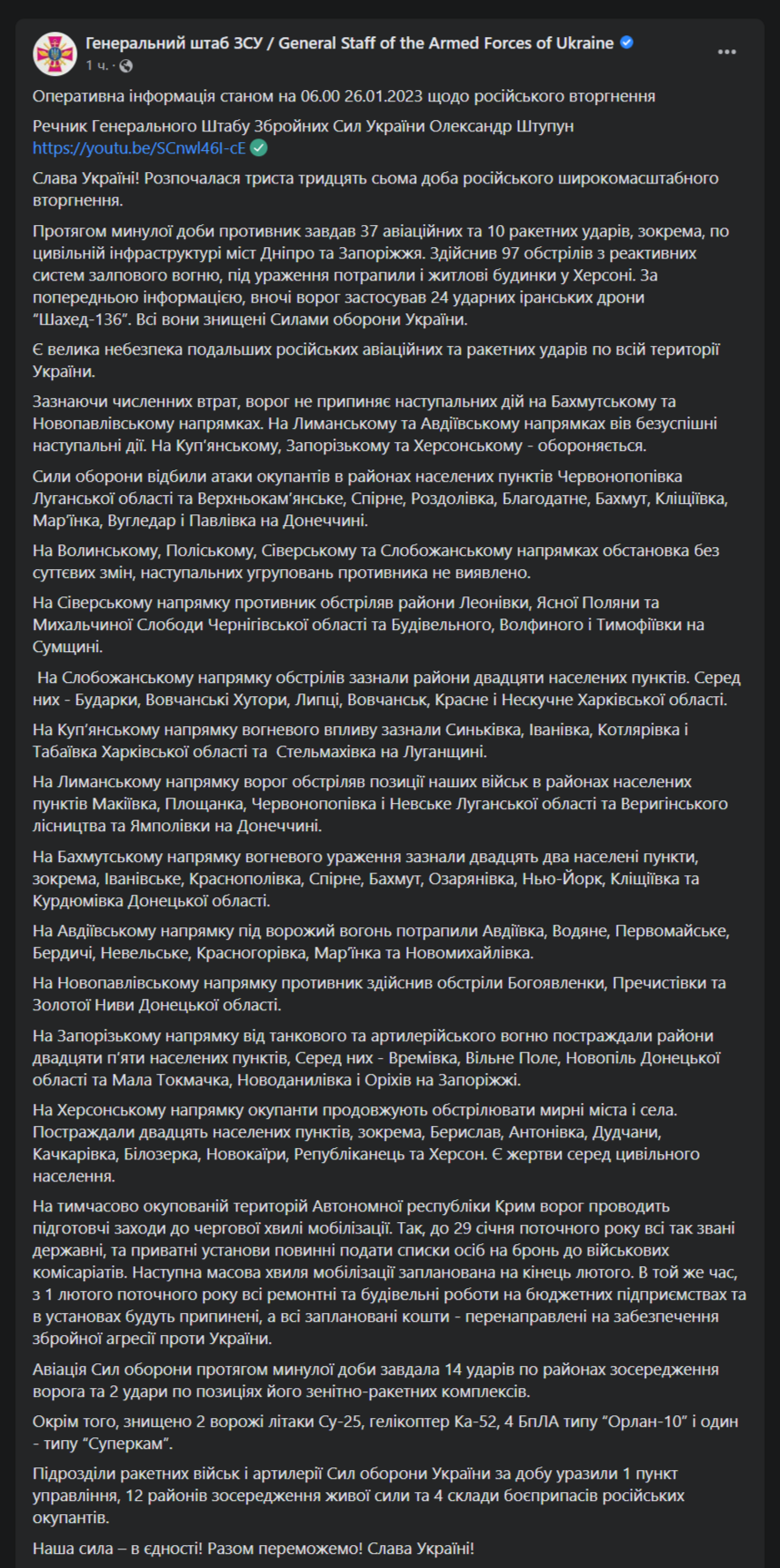 Війна в Україні триває вже 337-й день. Ми слідкуємо за новинами 26 січня у своєму онлайні.