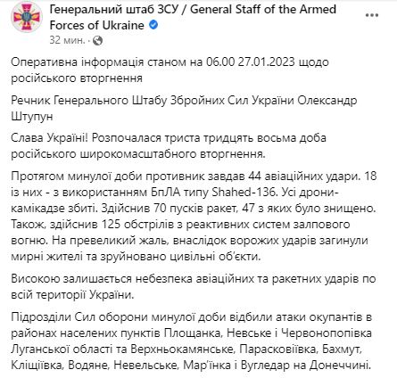 1. За добу противник завдав 44 авіаударів. 18 із них – з використанням безпілотників типу "Шахед". Усі дрони-камікадзе були збиті. Також 70 пусків ракет, 47 з яких було знищено, та 125 обстрілів із реактивних систем залпового вогню. Внаслідок ворожих ударів загинули мирні жителі, зруйновані цивільні об'єкти.