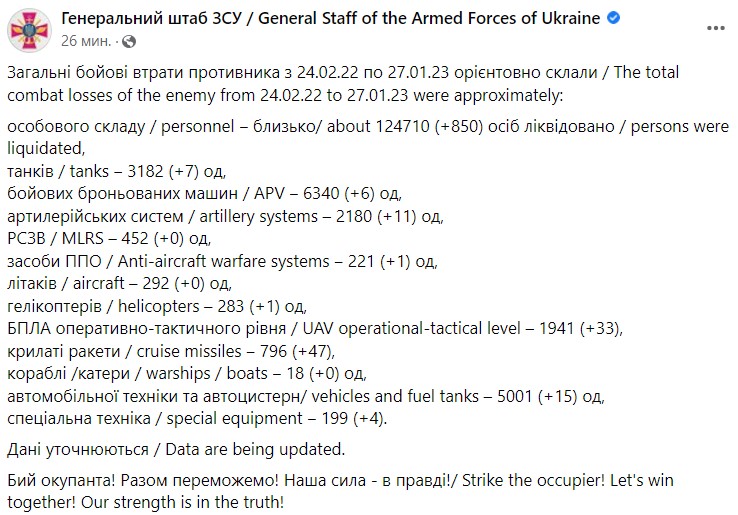 Генштаб Збройних сил України (ЗСУ) озвучив загальні бойові втрати армії РФ за час війни в Україні – з 24 лютого по 27 січня.