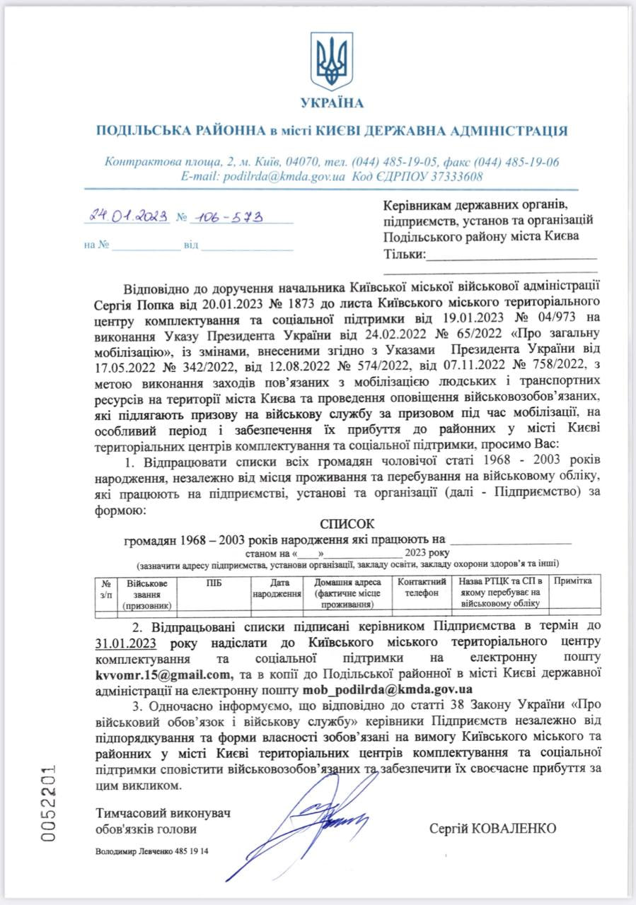 У тилу тим часом продовжують закручувати гайки з мобілізації. Сьогодні телеграм-канали опублікували фотозвернення Подільської держадміністрації Києва. Вона просить підприємства надати дані всіх мобілізованих до 31 січня.