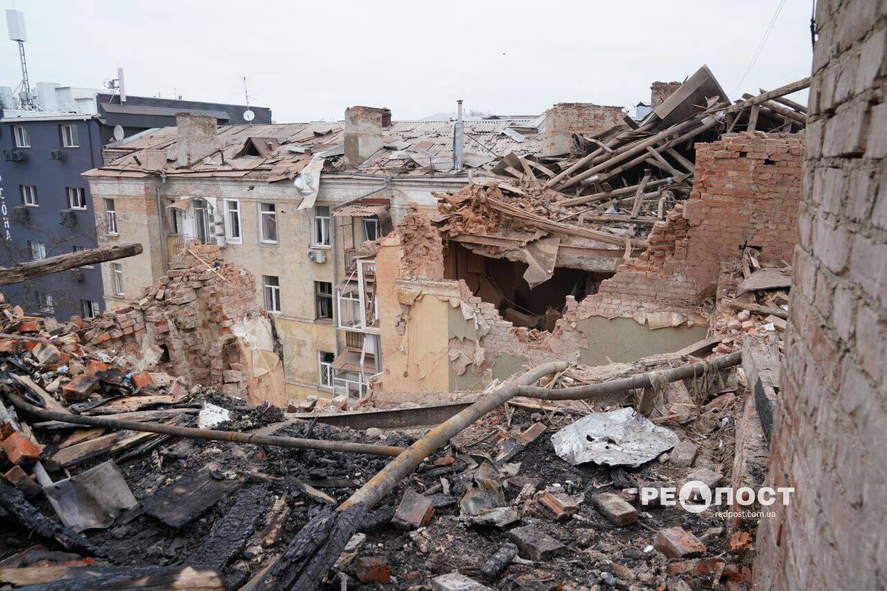 07.43 Цілу ніч розбирали завали будинку в центрі Харкова, куди потрапила ракета під час вечірнього обстрілу.