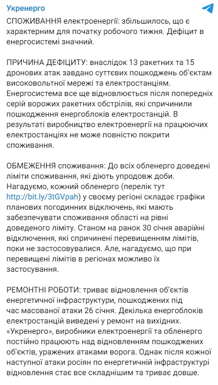Також енергетики ще працюють над усуненням наслідків атаки 26 січня. Декілька енергоблоків електростанцій було виведено на вихідних на ремонт.