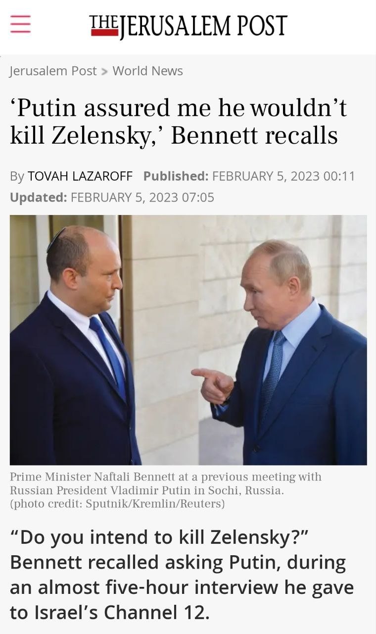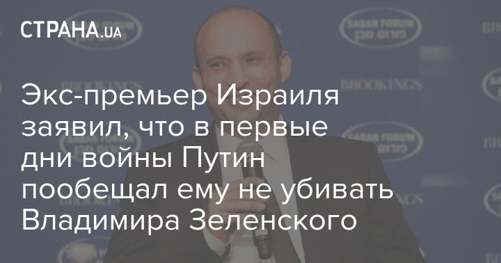 Президент РФ Володимир Путін пообіцяв не вбивати президента України Володимира Зеленського на зустрічі з тодішнім прем'єр-міністром Ізраїлю Нафталі Беннетом, яка відбулася у перші дні війни. Путін запевнив Беннета: "Я не збираюся вбивати Зеленського".