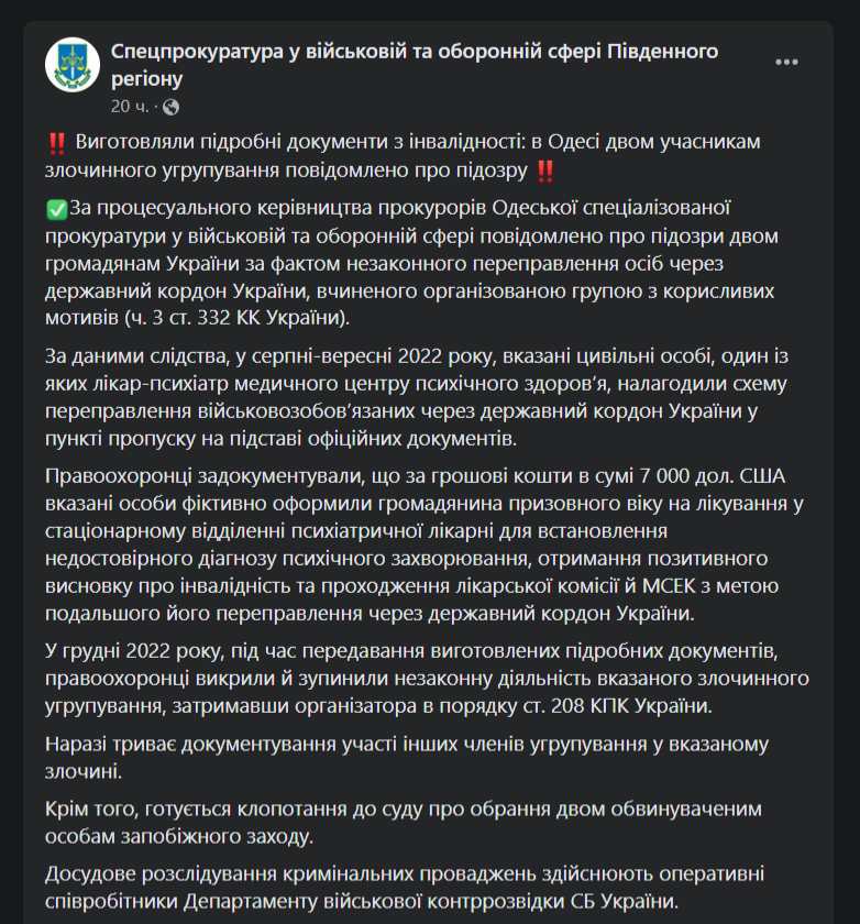 За даними слідства, у серпні-вересні 2022 року вказані фігуранти, один із яких - лікар-психіатр медичного центру психічного здоров'я, налагодили схему переправки військовозобов'язаних через державний кордон України у пункті пропуску на підставі офіційних документів.