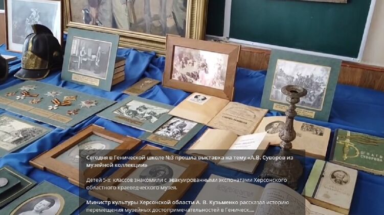 Повідомляється, що окупаційне "Міністерство культури Херсонської області" опублікувало відео де демонструються експонати з музейної виставки, присвяченої А. Суворову.