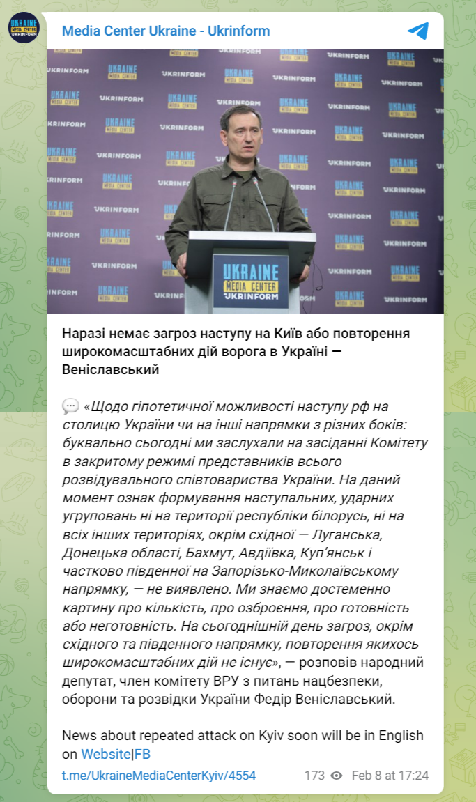"Про гіпотетичну можливість наступу РФ на столицю України або на інші напрямки з різних сторін: буквально сьогодні ми заслухали на засіданні комітету в закритому режимі представників усієї розвідувальної спільноти України. Наразі ознак формування наступальних, ударних угруповань ні на території Республіки Білорусь, ні на всіх інших територіях, крім східної — Луганської, Донецької області, Бахмута, Авдіївки, Куп'янська — і частково південної на запорізько-миколаївському напрямку, не виявлено. Ми знаємо точно картину про кількість, про озброєння, про готовність чи неготовність. На сьогодні загроз, окрім східного та південного напряму, повторення якихось широкомасштабних дій не існує", - сказав Вениславський.