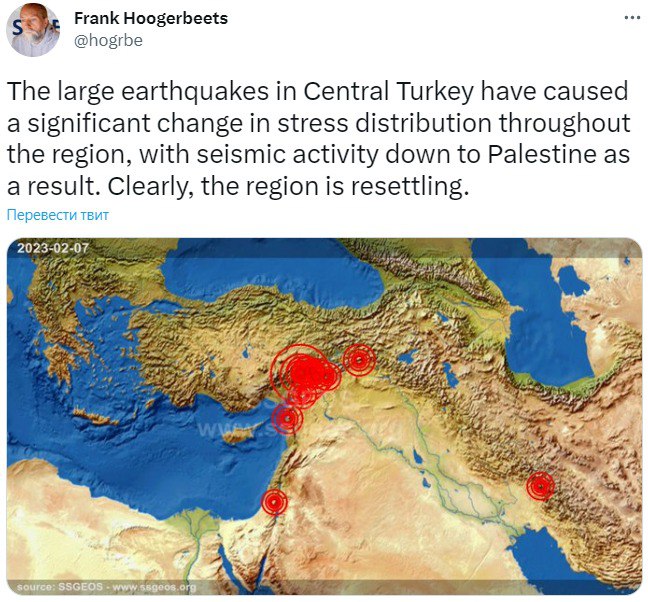 Голландський сейсмолог Франк Хугербітс, який передбачив землетрус у Туреччині та Сирії, написав, що весь близькосхідний регіон почав змінюватися.