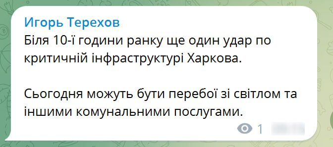 10.20 Мер Харкова підтвердив новий удар по місту. Приліт був за критичною інфраструктурою. Можуть бути перебої зі світлом та водою.