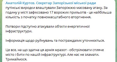 10.48 Запоріжжям зафіксовано два прильоти, повідомив секретар міськради Куртєв.