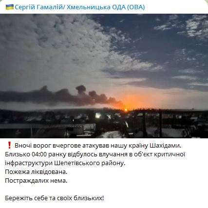 08.05 На Хмельниччині був приліт "Шахіда" по об'єкту енергетики в Шепетівському районі, повідомив губернатор Гамалій і опублікував фото.