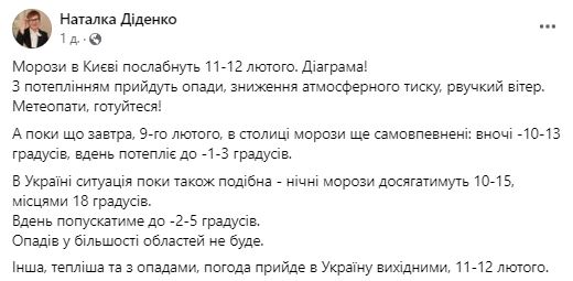Синоптик Наталія Діденко прогнозує, що морози в Києві ослабнуть уже цими вихідними 11-12 лютого. З потеплінням прийдуть опади, зниження атмосферного тиску, рвучкий вітер, пише вона.