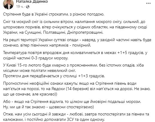 Синоптик Наталія Діденко пише, що Стрітення буде в Україні строкатим, із різною погодою.