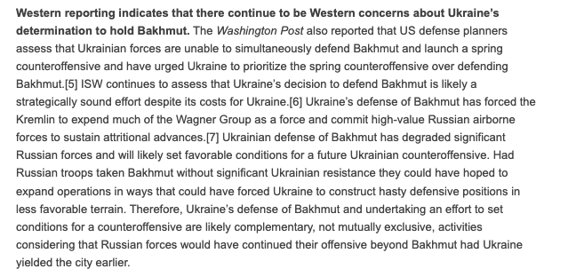 При цьому американські військові планувальники, як і раніше, вважають, що Україна не може одночасно захищати Бахмут і розпочати контрнаступ, і закликають віддати пріоритет контрнаступу. При цьому аналітики ISW зазначають, що оборона Бахмута змусила РФ задіяти не лише "вагнерівців", а й цінні російські повітрянодесантні сили.