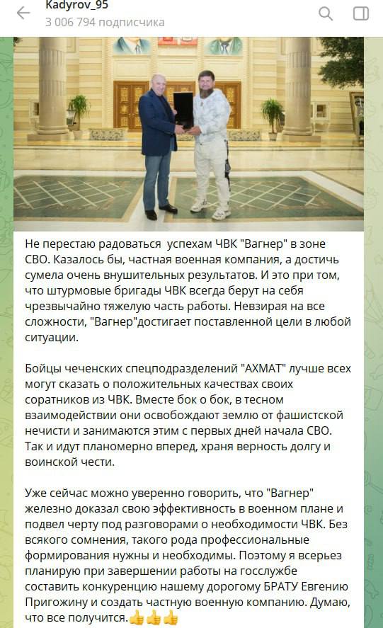 "Не перестаю радіти успіхам ПВК "Вагнер" у зоні СВО. Здавалося б, приватна військова компанія, а досягти зуміла дуже значних результатів. І це при тому, що штурмові бригади ПВК завжди беруть на себе надзвичайно важку частину роботи... Тому я всерйоз планую при завершенні роботи на держслужбі скласти конкуренцію нашому дорогому брату Євгену Пригожину та створити приватну військову компанію", - написав Кадиров у своєму телеграм-каналі.