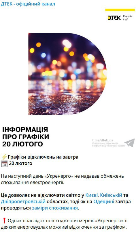 18:59 На завтра "Укренерго" не надавав обмеження споживання електроенергії, повідомляє ДТЕК.