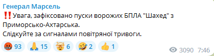 "Увага, зафіксовано пуски ворожих БПЛА "Шахед" із Приморсько-Ахтарська. Слідкуйте за сигналами повітряної тривоги", - пише Мельник.