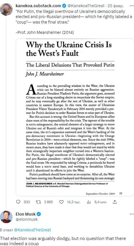 Відповідаючи на репліку користувача Kanekoa (який процитував думку одного американського вченого-історика про те, що повалення президента Януковича стало для Путіна "останньою краплею"), Маск написав: "Ці вибори (2010 - Ред. ), можливо, були сумнівними, але немає жодних сумнівів у тому, що переворот справді був".