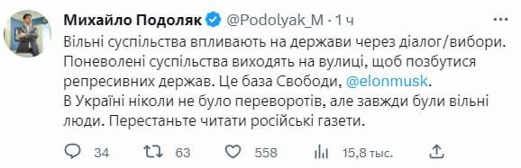 "Вільні товариства впливають на держави шляхом діалогу/виборів. Поневолені товариства виходять на вулиці, щоб позбутися репресивних держав. Це база Свободи, Ілон Маск. В Україні ніколи не було переворотів, але завжди були вільні люди. Перестаньте читати російські газети", - написав Подоляк у себе у твіттері.