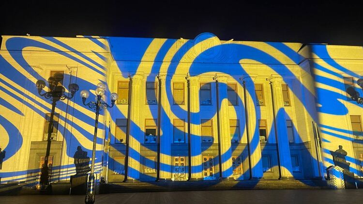 Відомий швейцарський художник підсвітив будівлі у Києві на річницю війни. Фото