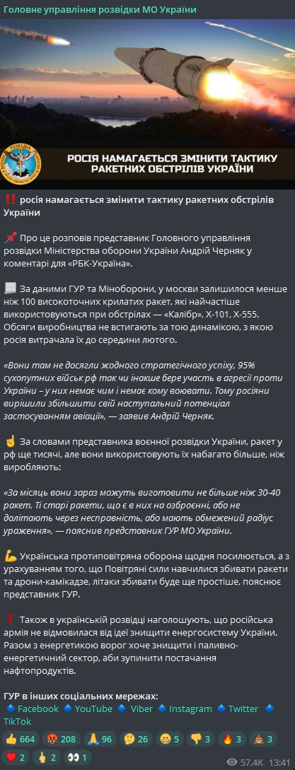 За даними ГУР, у Москви залишилося менше сотні високоточних крилатих ракет, які найчастіше використовуються під час обстрілів. Зокрема йдеться про ракети "Калібр", Х-101, Х-555.
