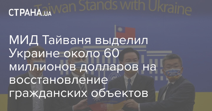 Міністерство закордонних справ Тайваню виділило 1,8 млрд тайванських доларів (приблизно 56 млн доларів США) з бюджету країни на поточний рік для надання допомоги у відновленні України. Гроші підуть на проекти громадської інфраструктури.