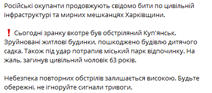 "Небезпека повторного обстрілу залишається високою. Будьте обережні, не ігноруйте сигнали тривоги", - додав він.