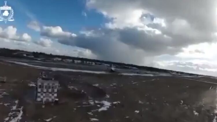 Самого моменту зіткнення із літаком на відео немає. На кадрах процес розвідки, дрон спокійно залітає на територію аеродрому, кружляє навколо російського літака і навіть здійснює посадку прямо на його антену РЛС, а потім просто відлітає.