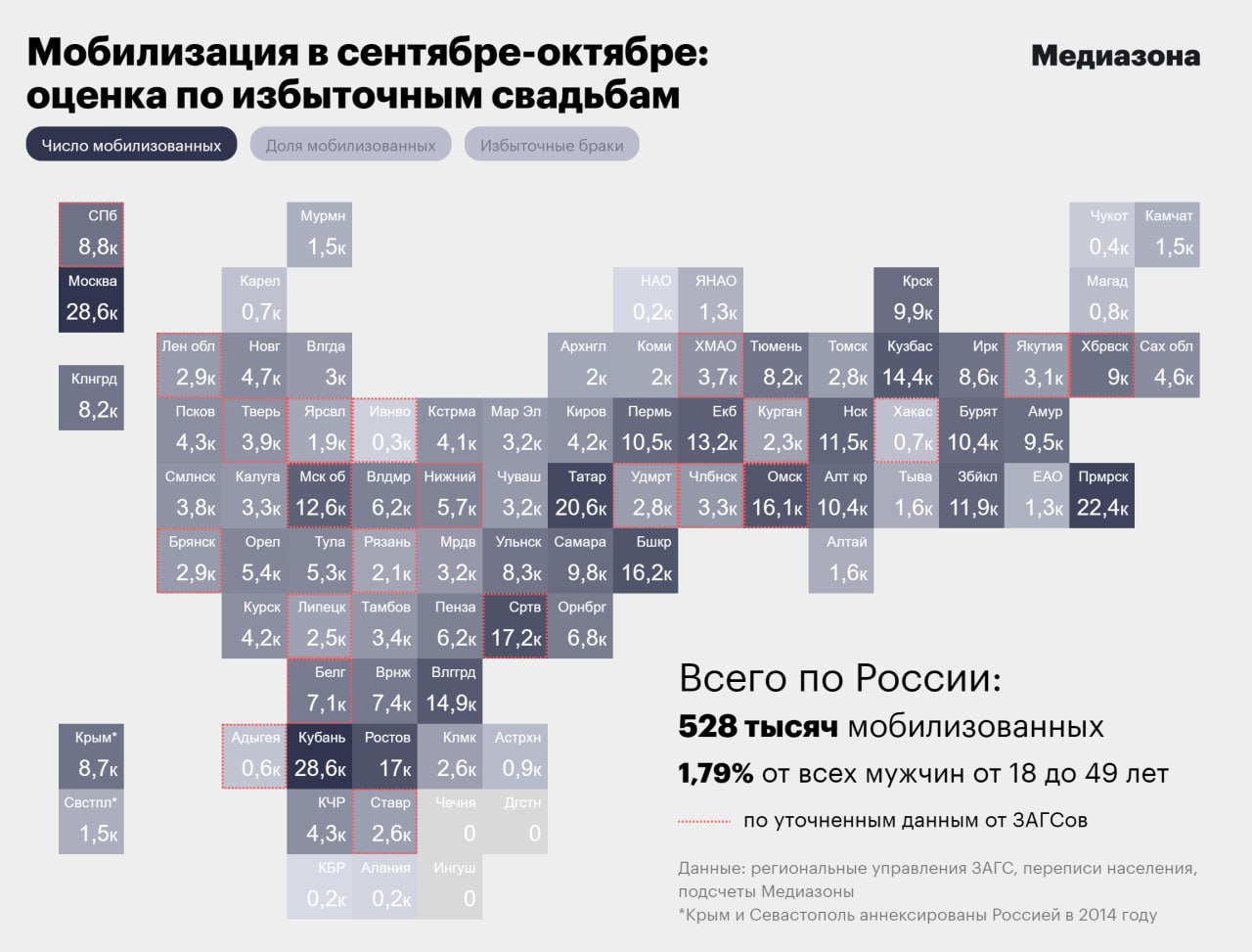 Далі вони дійшли висновку, що частка таких чоловіків у всіх регіонах Росії становить 1,79%. І екстраполювали ці дані на загальну кількість чоловіків призовного віку, отримавши підсумкову цифру – 520 тисяч мобілізованих.
