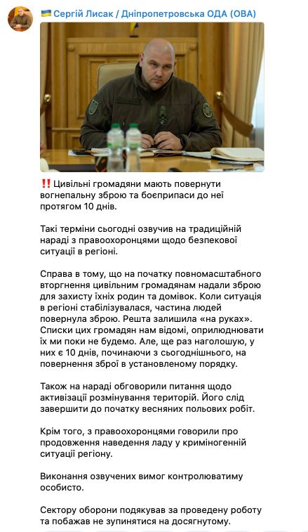 Влада Дніпропетровської області закликала громадян протягом 10 днів добровільно здати вогнепальну зброю та боєприпаси, яку масово роздавали на початку війни.
