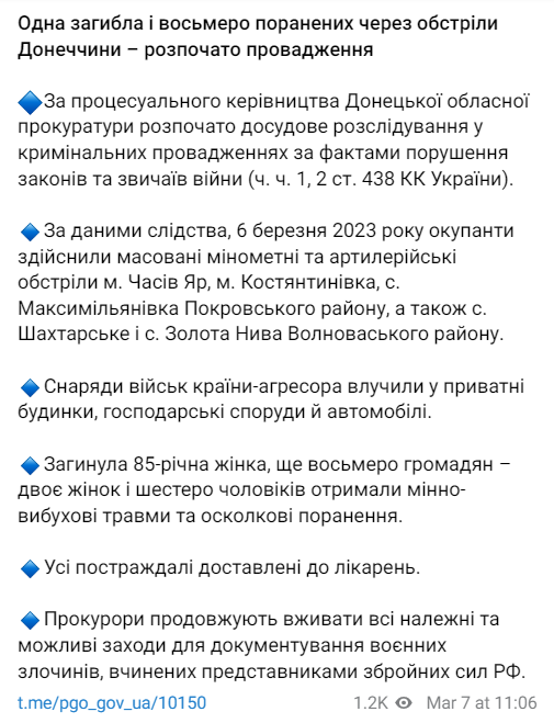 На Донеччині через обстріл російськими військовими 6 березня загинула 85-річна жінка. Ще 8 людей отримали поранення. Офіс генпрокурора розпочав досудове розслідування за фактами порушення законів та звичаїв війни (ч. ч. 1, 2 ст. 438 КК України).