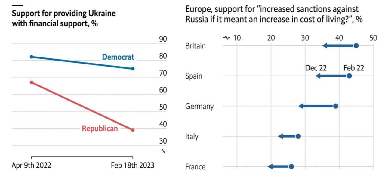 Також знизилася підтримка запровадження санкцій у країнах ЄС. У лютому 2022 року у Великій Британії за це висловлювалося 45% респондентів, у грудні – 35%. Аналогічне зниження відбулося у Франції (приблизно з 25% до 20%), Німеччини (з майже 40% – нижче 30%), Італії та Іспанії.