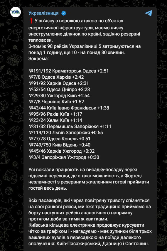 07:05 У зв'язку з ударами по об'єктах енергетичної інфраструктури почали затримуватись потяги.