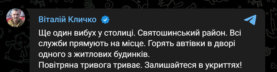 07:16 Ще один вибух у столиці, що у Святошинському районі, повідомляє Кличко.