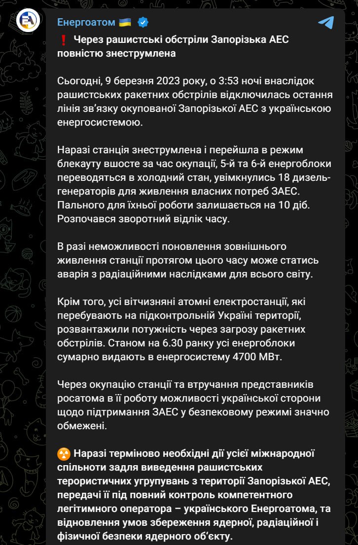 Там попереджають, що у разі неможливості поновлення зовнішнього живлення станції "може статися аварія з радіаційними наслідками для всього світу".