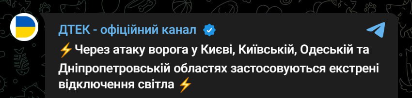 07:40 Через ракетну атаку у Києві, Київській, Одеській та Дніпропетровській областях застосовуються екстрені відключення світла. Про це повідомила компанія ДПЕК.