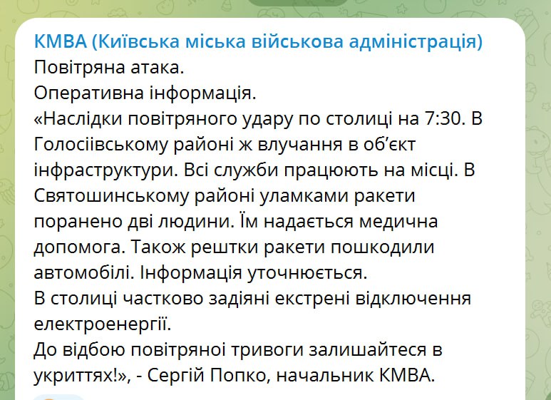 - у Святошинському районі уламками ракети поранено двох людей. Їм надається медична допомога. Також останки ракети зашкодили автомобілі.