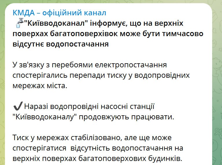 07:50 У Києві на верхніх поверхах багатоповерхівок може бути тимчасово відсутнє водопостачання, попереджає водоканал. Причина – перебої зі світлом.