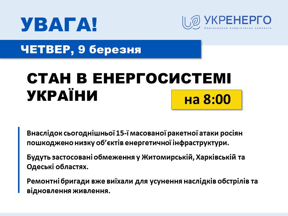 08:02 "Укренерго" заявляє про запровадження екстрених обмежень у Житомирській, Харківській та Одеській областях.