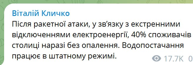 08:04 40% киян після ракетної атаки залишилися без опалення, повідомив мер Віталій Кличко.